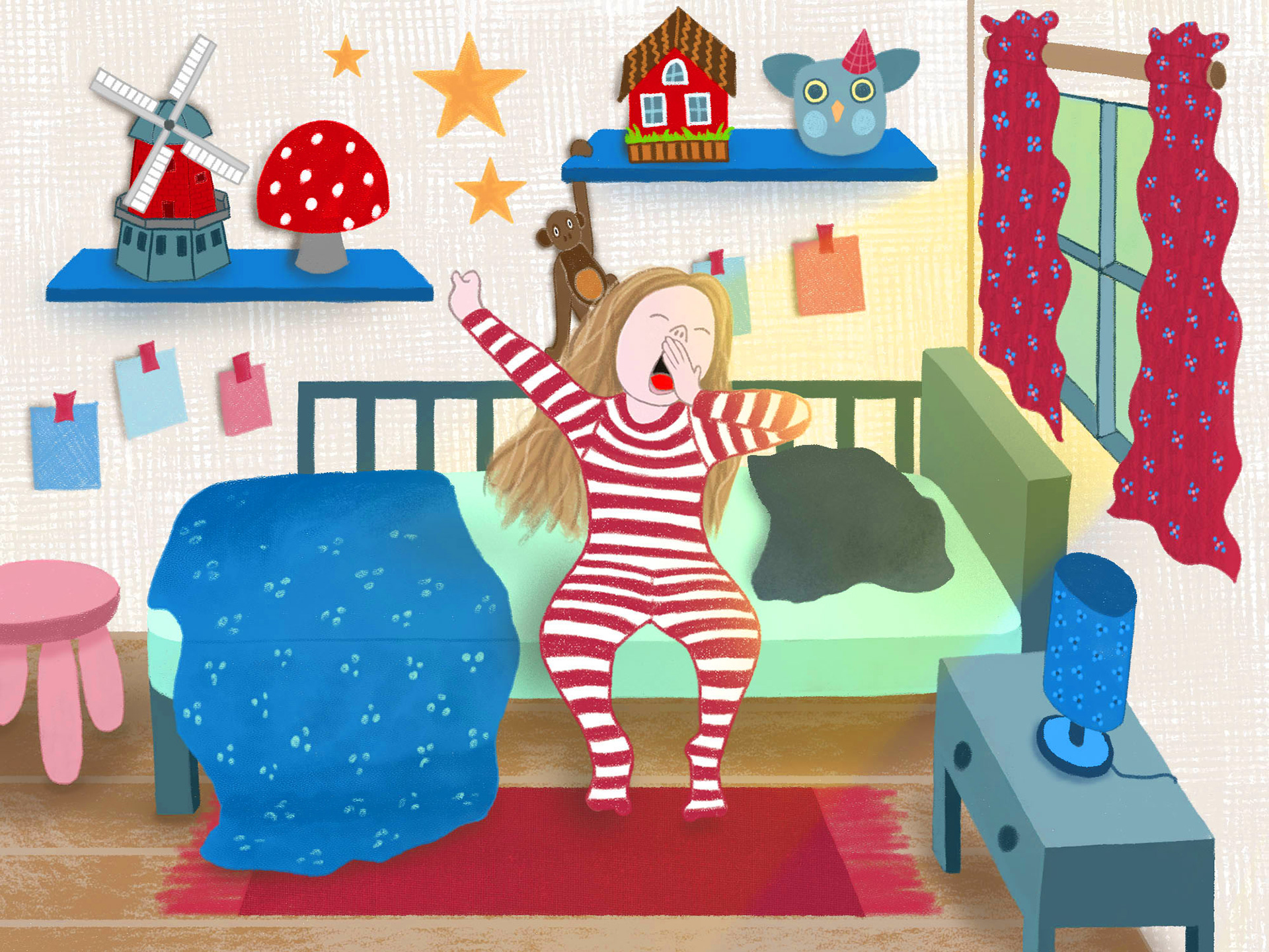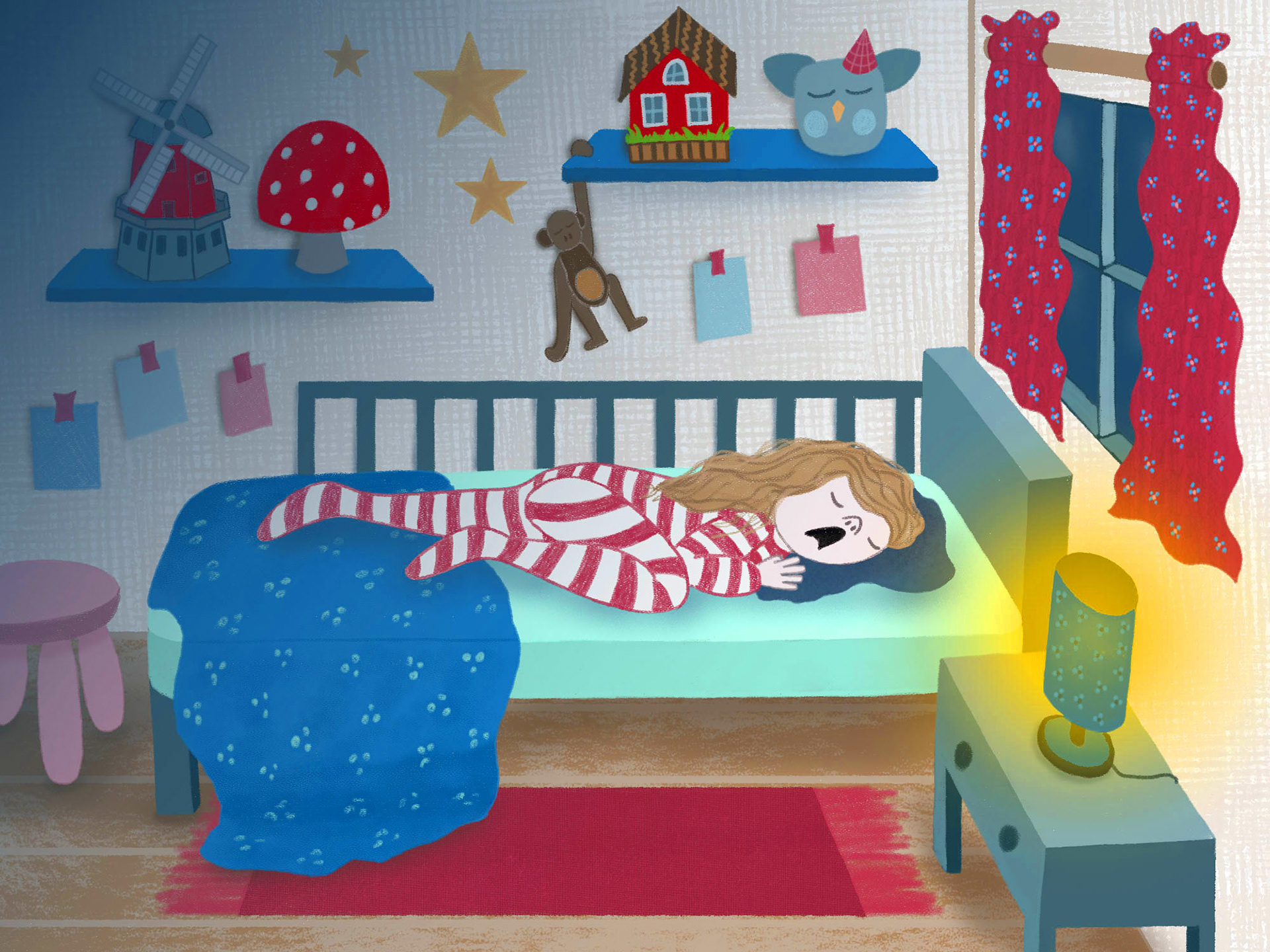 Criança no quarto em dois momentos: dormindo e acordando.